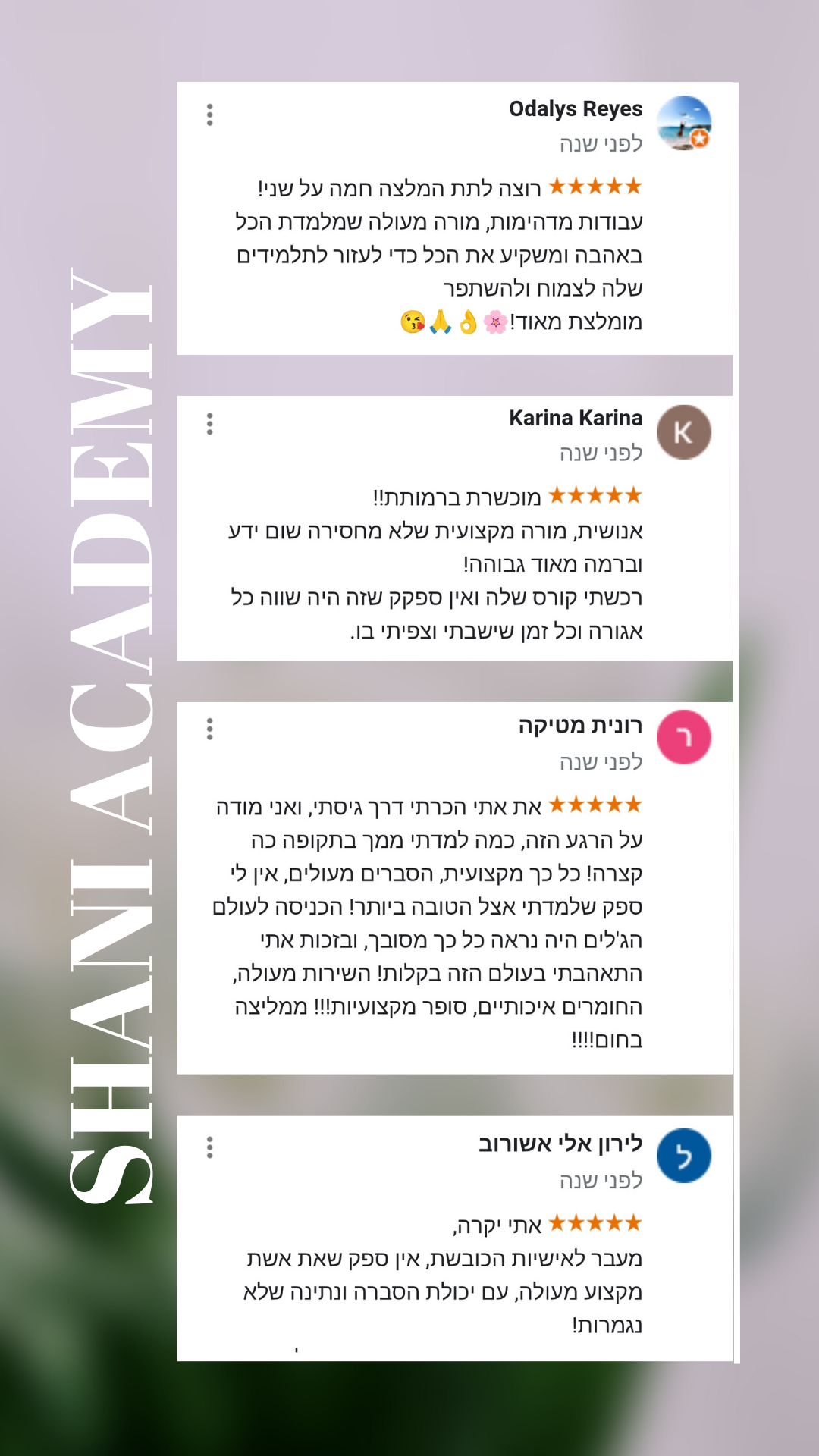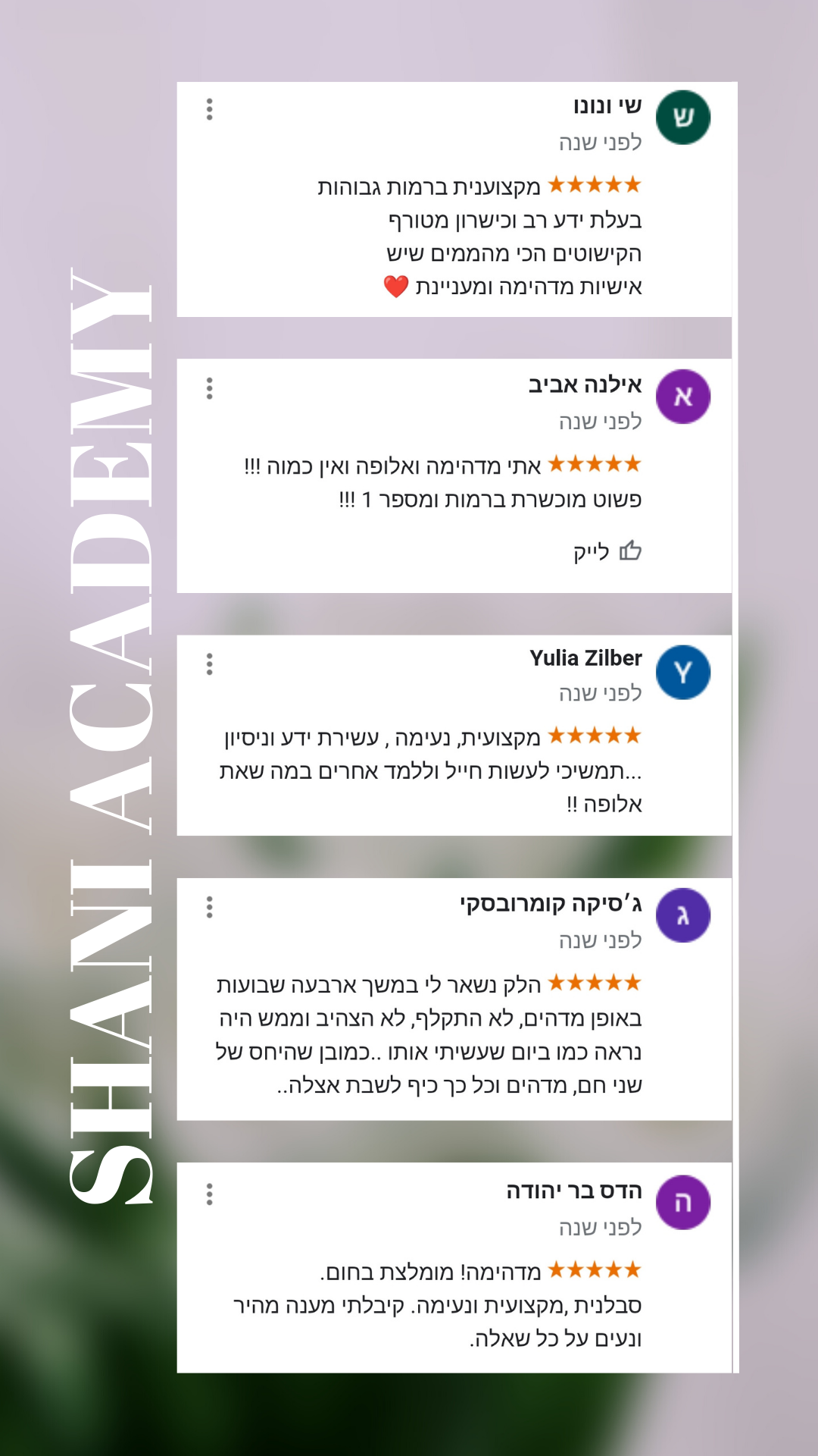 למה ללמוד אצלי? הקורסים שלי תוכננו במיוחד עבור טכנאיות ציפורניים שרוצות ללמוד את הכלים המתקדמים ביותר בעולם הציפורניים ולהתמחות בטכניקות עבודה ויצירה יעילות וחדשניות. אני מעניקה תמיכה וליווי אישי במהלך הקורס וגם לאחריו, כך שלא תישארי לבד בשום שלב ומנהלת קהילה גדולה של מומחיות בתחום. הצטרפי עכשיו והכניסי קסם ויצירתיות לכל עיצוב ציפורניים!